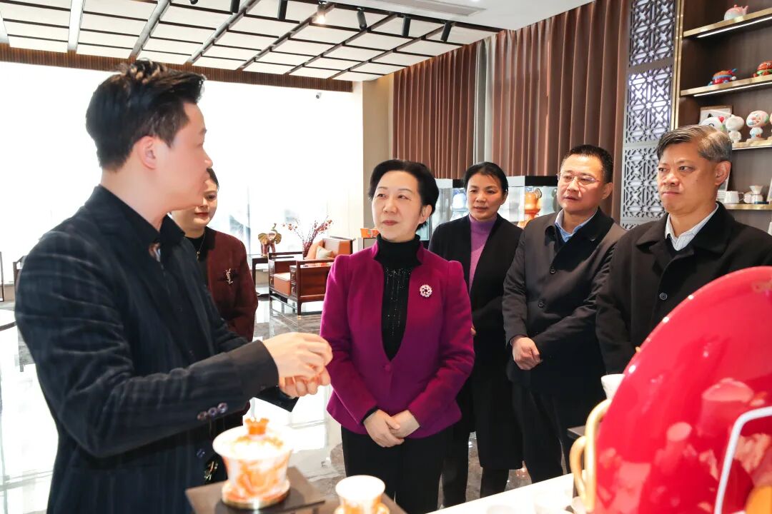 在辰天陶瓷有限公司,胡雪梅详细了解企业产品设计、开发制造、品牌合作及市场开拓情况,鼓励企业深耕陶瓷创意设计领域,做大规模、做出品牌。她指出,景德镇是文化创意产业发展的“富矿”,要深入挖掘各类馆藏精品的纹饰、器型等文化元素,将其转化为现代设计灵感与文创产品。要紧跟时代风尚,联动优质IP,嫁接新兴业态,创新营销方式,把取之不尽的文化“富矿”转化为蓬勃发展的文创产业。